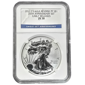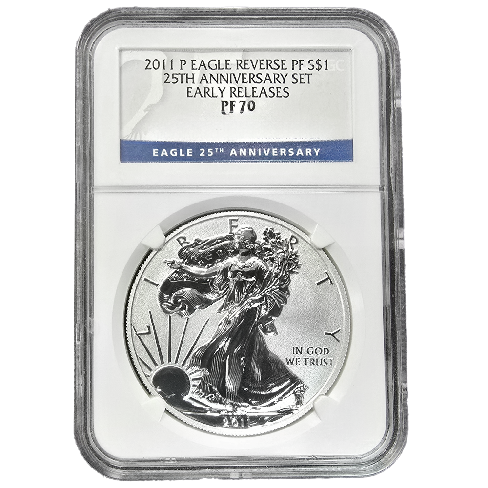 Introducing the 2011-P Reverse Proof Silver Eagle graded PF70 by NGC, a special release from the 25th Anniversary Silver Eagle Set.